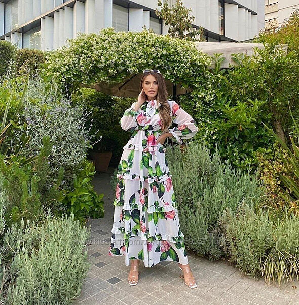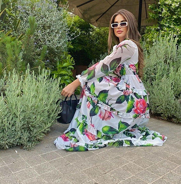 Платье украшено ярким цветочным принтом, который добавляет женственности и романтичности. Прекрасно подойдет для торжественных мероприятий, прогулок или летних вечеринок. Длина в пол и легкий шифон создают эффектный и утонченный силуэт.