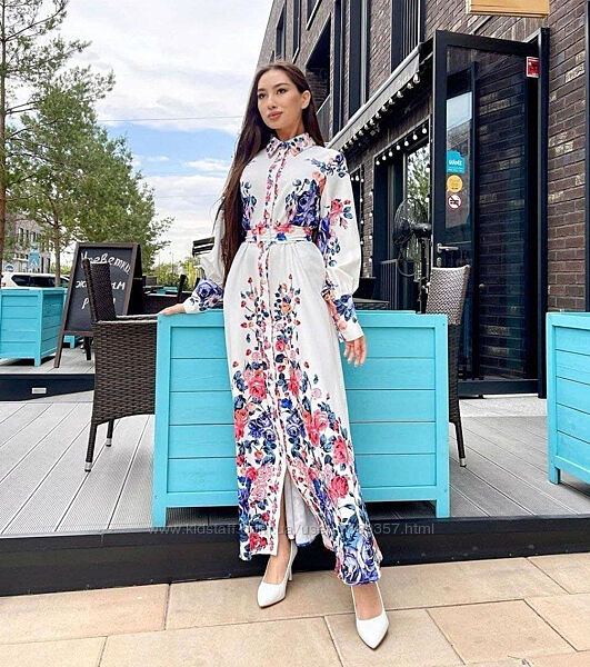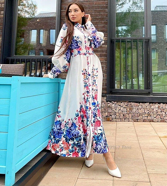 Платье украшено ярким цветочным принтом, который добавляет женственности и романтичности. Прекрасно подойдет для торжественных мероприятий, прогулок или летних вечеринок. Длина в пол создает эффектный и утонченный силуэт.