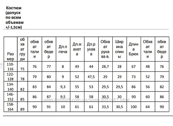| Рост | 110 см, 116 см, 122 см, 128 см, 134 см, 140 см, 146 см, 152 см, 158 см |