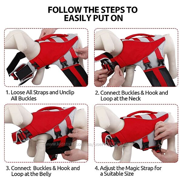 Легко одягається і знімається: рятувальний жилет для тварин має подвійну застібку з пряжками і чарівними наклейками. Спочатку дайте вашому улюбленцю встати, потім одягніть рятувальний жилет на спину, застебніть застібки і завершіть надягання жилета. Незабаром ваш улюбленець звикне до рятувального жилета.