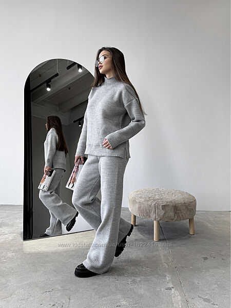 Доставка: Нова пошта (наложка з передоплатою або повна оплата), Укр пошта (повна оплата).Теплий неперевершений костюм з рівними брючками і трохи подовженим светром з розрізами у боках.
