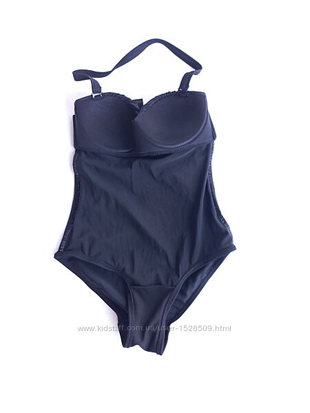 Елегантний цілісний купальник бюстьє NEXT. Колір чорний, на животі драпірування, одна лямка за шию. Чашки ліфчика ущільнені. Уживаний 1 раз на фотосесію, акуратно, з гігієнічною прокладкою, стан відмінний.Розмір вказано 8/36. Мірки: довжина по центру від бюста без розтягування 46 см, ширина грудей під пахвами від 30 до 38 см. Чашка В.