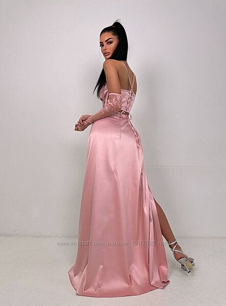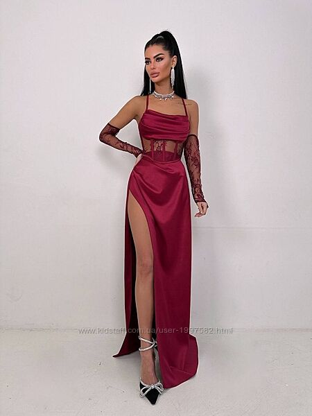 Подробное описание: Вечірній костюм атласний зі спідницею максі з розрізом з рукавичками корсет