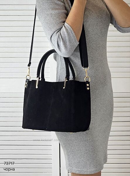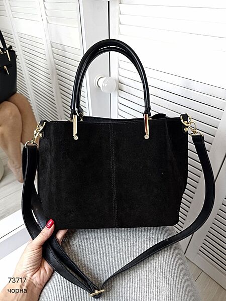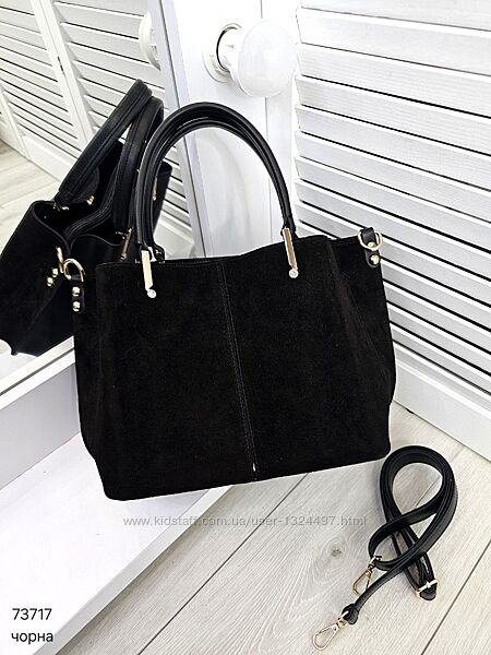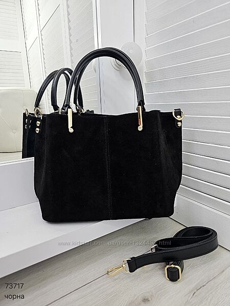 Гарна, невелика сумка на 3 відділи з натур.замші та екошкіри Код: 73717 замшРОЗМІРИ: Ширина по низу - 25 см, висота - 20 см, дно - 13 см + ручки короткі ( 32 см ) і зйомний довгий ремінець ( 118 см )