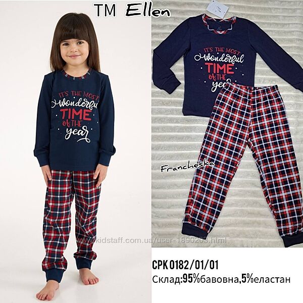 Універсальна дитяча піжама з колекції "CHRISTMAS MOOD" (CPK 0182/01/01) від українського виробника Ellen ідеально підійде як дівчаткам так і хлопчикам.Піжама дитяча виготовлена з якісного бавовняного полотна, складається з кофти з довгим рукавом синього кольору, прикрашеної спереду принтом і штанів у клітинку.Знизу на штанах є комфортний манжет.