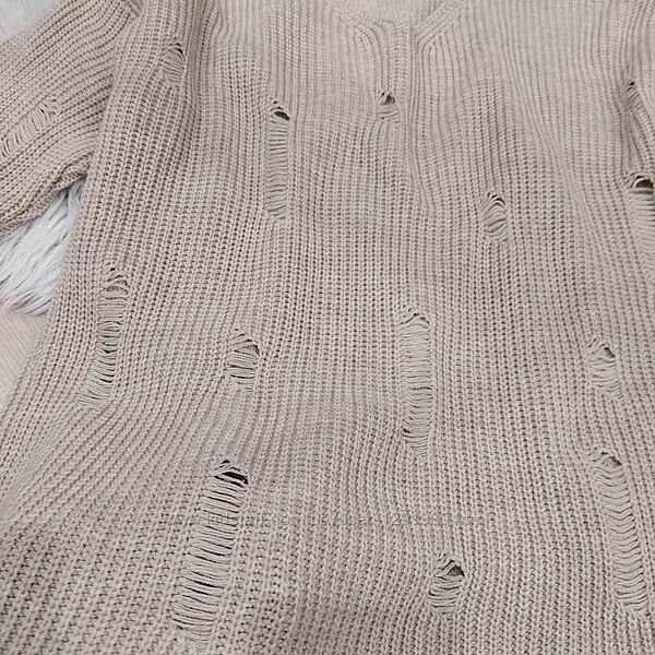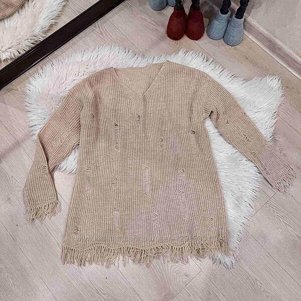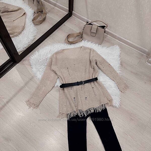 Для стильних та затишних буднів в осінньо-зимовий період модницям знадобляться красиві в´язані туніки. Туніка рвана дуже стильно доповнюватиме твій зимовий образ під теплі лосини. Чудова туніка, приємна до тіла. не колеться, м´яка. Фасон вирізу горловини: V-подібним Розмір універсальний, підійде на будь-які параметри, від S до L. Стан ідеальний. Заміри: довжина: 65 см+ 4 см бахрома рукав від горловини: 58 см + 4 см бахрома пог: 55 см