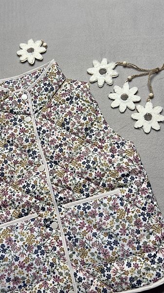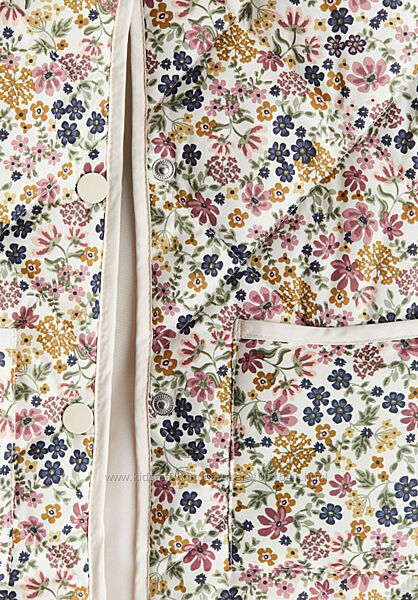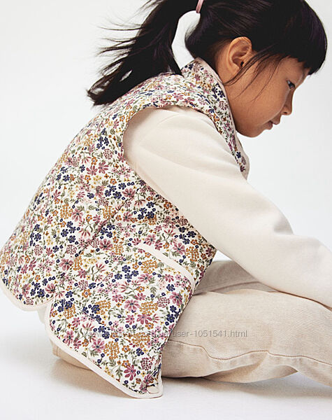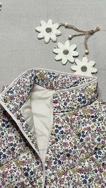 Cтьобаний жилет від H&M з коміром-стійкою, на кнопках , є захист підборіддя для запобігання подразнення шкіри , великими кишенями спереду, ,без капюшона , утеплювач-тонкий синтипон .Колір- квітковий принт