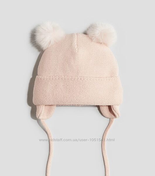 В´язана шапка з м´якої суміші бавовни від H&M молочного кольору , з двома помпонами зі штучного хутра вгорі. Шапка має підігнуті поля, вушні краї та зав´язки під підборіддям. На підкладці з флісу.СКЛАД - 60% бавовна, 40% акрил.