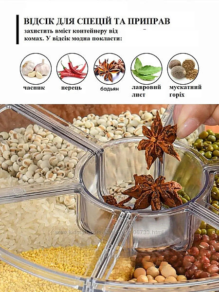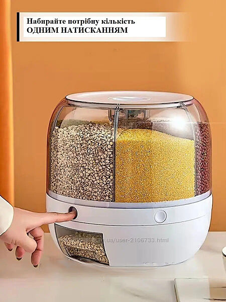 Подробное описание: Вращающийся диспенсер для хранения сыпучих продуктов круп с дозатором на 6