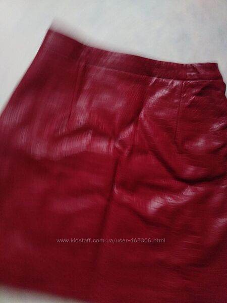 Юбка под кожу,вишнёвого цвета,впереди с замочками,расклешенная книзу,в отличном состоянии,б.у.Лёгкая,почти новая.