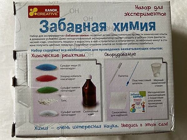 Набор для экспериментов «Забавная химия» позволит детям самостоятельно провести химические опыты в домашних условиях. Даже неподготовленный экспериментатор сможет при помощи химических реактивов построить «пещеру со сталактитами и сталагмитами» на столе, вырастить фантастический «сад» в стакане, вырастить цветных медуз или получить синий студень. В комплекте: химические реактивы, оборудование, методические рекомендации с пошаговым описанием проведения опытов.Возраст 10 - 12 лет