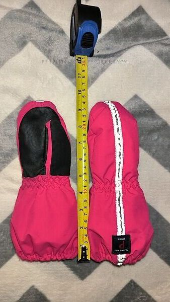 Комфортні теплі рукавички, заміри на фото.Не промокають, не продуваються вітром. Дуже комфортні та зручні, завдяки резинці одягаються наверх куртки.Малопомітні сліди бу лише на великих пальчиках та світловідбивачах , все інше в ідеалі.