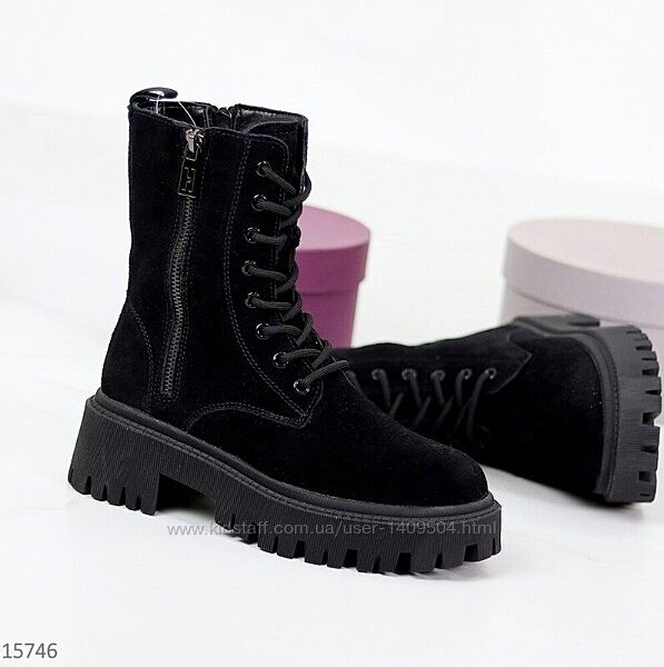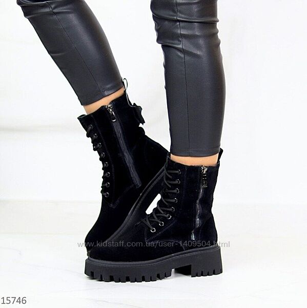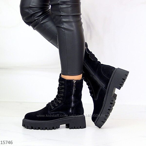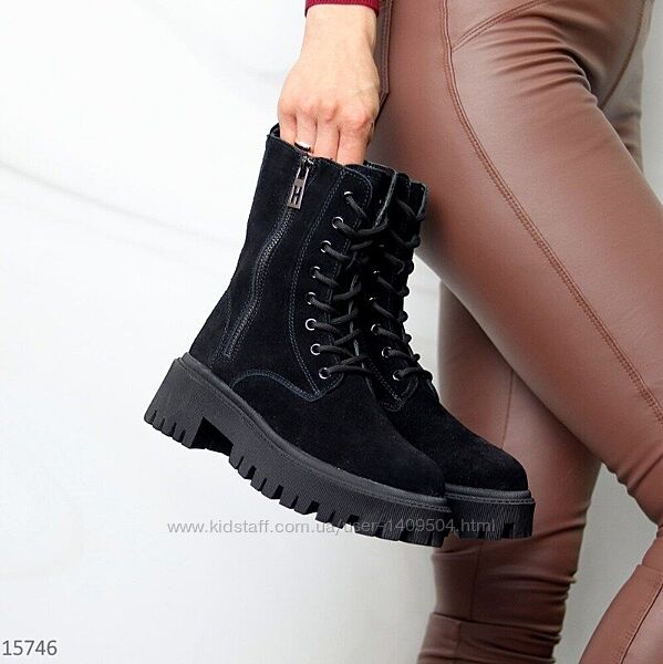 Стильні зимові черевики з натуральної замші на товстій підошві. Зашнуровуються, середина утеплена теплим, густим напівшерстяним набивним хутром. Збоку є функціонуючий замок для зручності взування. Зовні декоровані замком. Замша класної якості, взуття гарно пошите і дуже стильно виглядає на нозі.