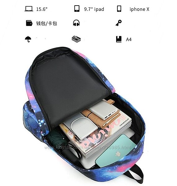 У рюкзаку одне велике основне відділення. Всередині є ущільнене відділення для планшета або електронної книги .На лицьовій частині рюкзака містка кишеня на блискавці для дзеркала, серветок та дівочих дрібничок.