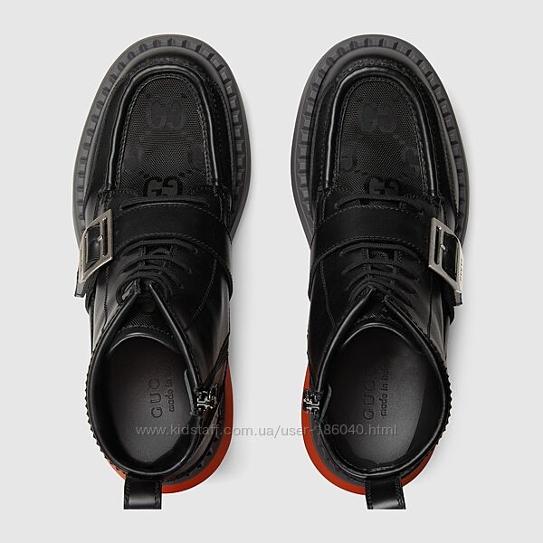 • Колір: чорний, сірий, оранжевий • Склад: 100% натуральна шкіра • Оздоблення: 100% текстиль • Застібка: блискавка, шнурівка • Внутрішнє оздоблення: 100% натуральна шкіра • Декор: принт GG • Срібляста фурнітура під старовину • Підошва: гума • Підошва: 5 см • На моделі розмір 10 • Параметри виробу для розміру 10: довжина устілки – 29 см, ширина устілки – 9 см • Виробництво: Італія