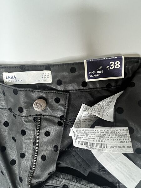 Брюки в горошок ZARA. Нові, оригінал. Розмір 38, скінні з високою посадкою. Довжина 94, крок 69 см, талія 36, стегна 46 см, посадка 30/34 см, штанина внизу 12 см. 80% котон, 28% поліестер, 2% еластан Тканина тягнеться. Виробництво Турції.
