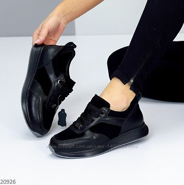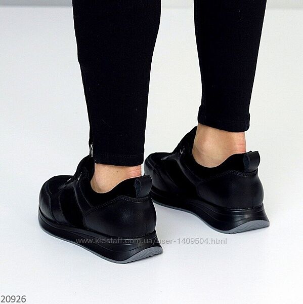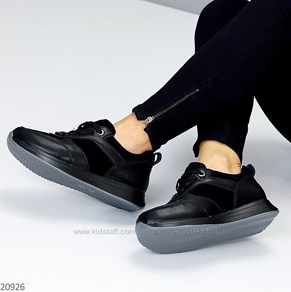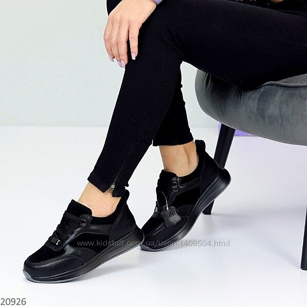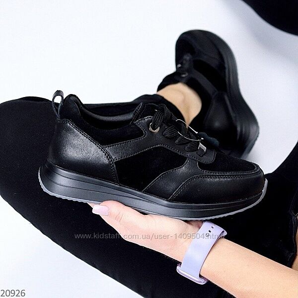 Чорні шкіряні жіночі кросівки з натуральної шкіри та натуральної замші. Класно виглядають на нозі. Зашнуровуються, легкі та зручні. Сучасне взуття за доступною інтернет-ціною та без посередників.