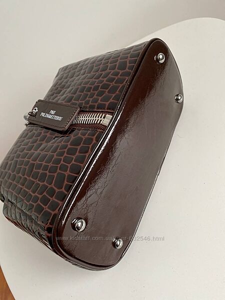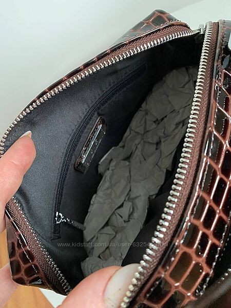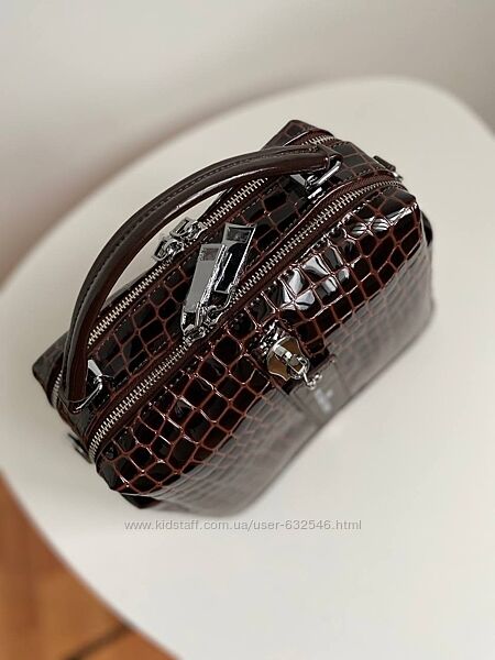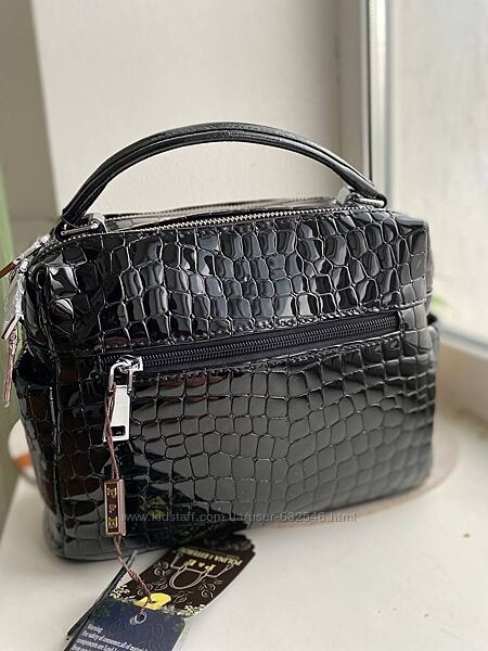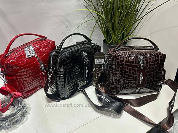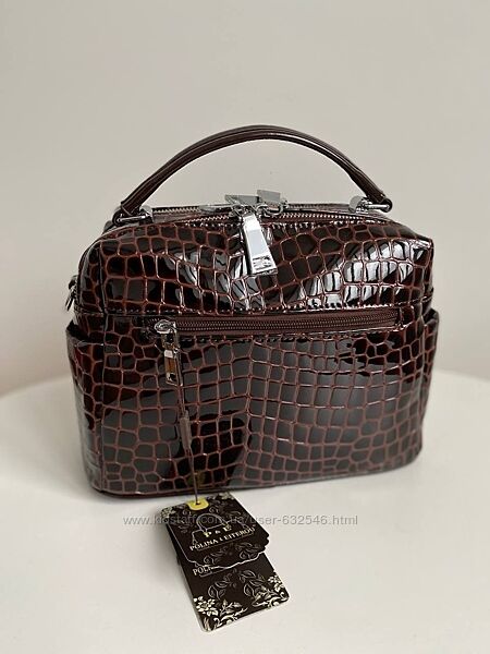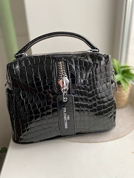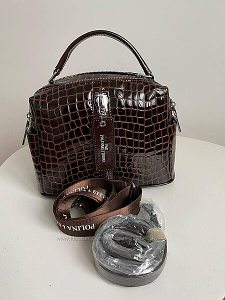 Жіноча сумка Polina & Eiterou з натуральної лакованої шкіри з тисненням «кроко» - елегантний і стильний аксесуар. У комплект входять два ремені: один зі шкіри для класичного образу і один тканинний для більш повсякденного стилю. Сумка закривається на змійку. Має також зручну ручку для носіння.