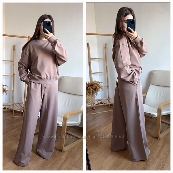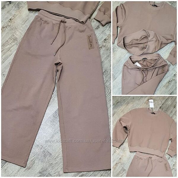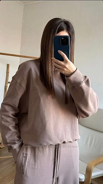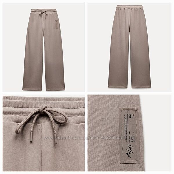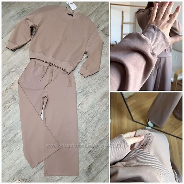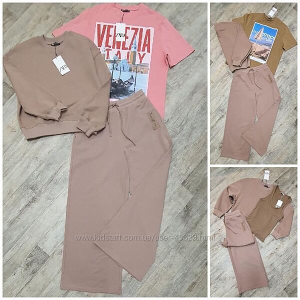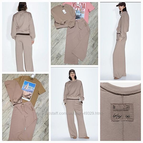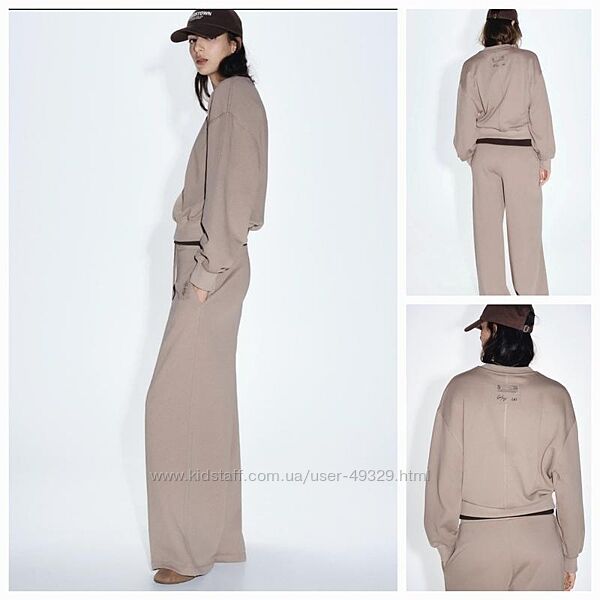 Нереально стильний і красивий костюм Zara в стилі miu miu.Лімітована колекція. Колір і якість-просто вогонь. Широкі штани з еластичним поясом і шнурками для регулювання, лейбл в тон на передній частині ноги.Світшот з круглим коміром ідовгими рукавами. Лейбл і окантовка в рубчик на спині.