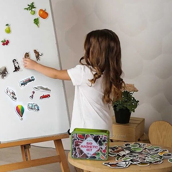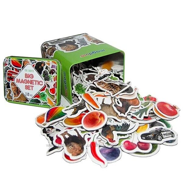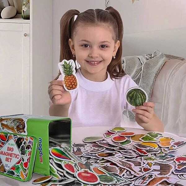 У металической коробці зібрані реальні зображення тварин ферми та зоопарку, траспорт, овочі, фрукти та ягоди. Грати з ними можна нескінченно!- Вивчай назви.
