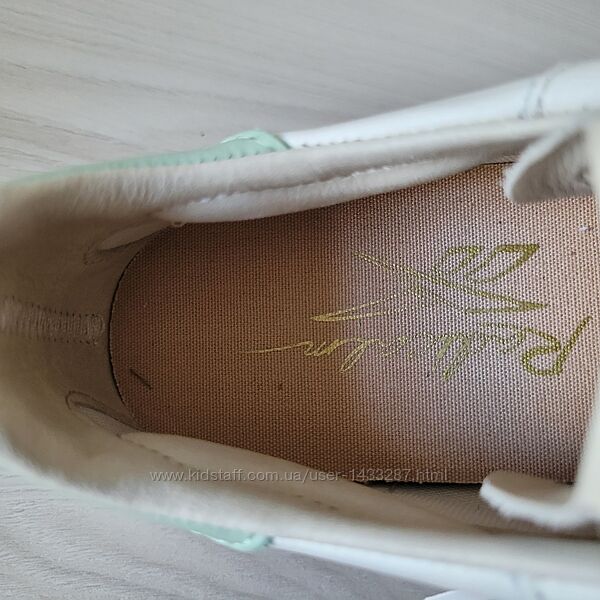 Верх із м´якусінької шкіри. Серединка текстильна На задніку під кісточками - подушечки. Устілка текстильна Підошва, прогумована, неслизька, гнучка. Фабрично прошиті. Колір молочний + м´ятний