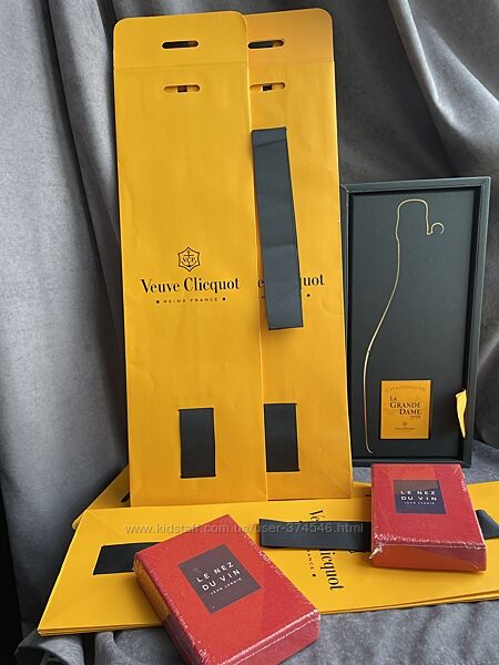 Есть вращающаяся витрина (800) и картонные упаковки Veuve Clicquot, абсолютно новые, плотные, с гофрированными черными лентами, по 300 грн. Наборы нос вина мини 4500