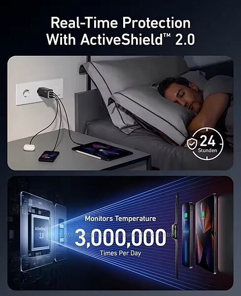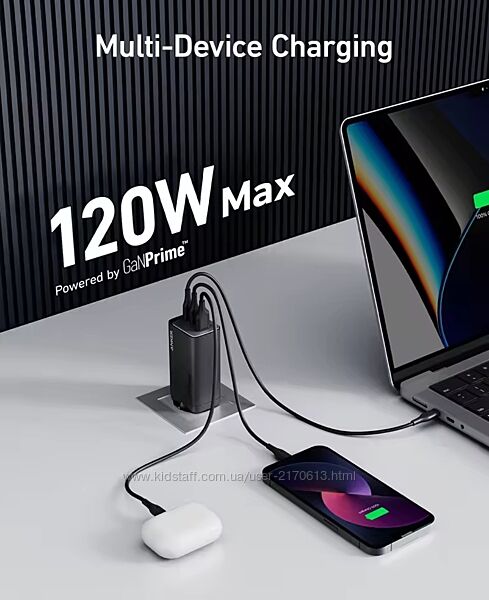Двопортове заряджання: USB-C 1 (верхній порт) і USB-C 2, (середній порт) USB-C 1 + USB-C 2: макс. 120 W, USB-C 1 + USB-A: макс. 120 W, USB-C 2 + USB-A: макс. 24 W;