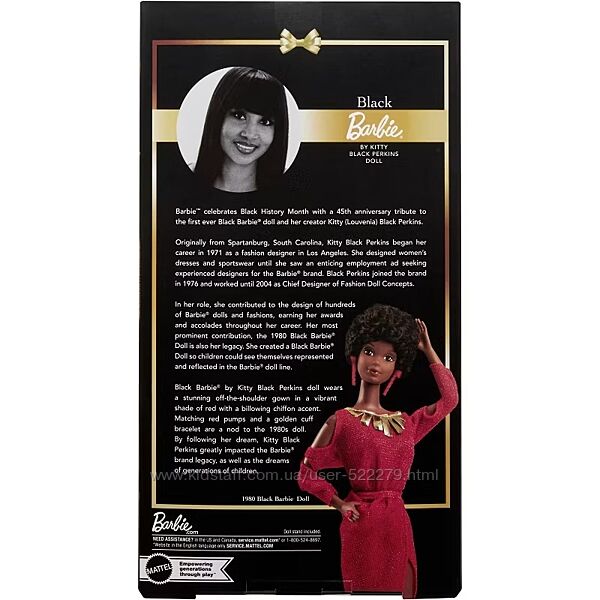 Нова в упаковці.Барбі вшановує 45-ту річницю першої чорношкірої ляльки Барбі колекційною колекцією, яка вшановує її творця, Кітті Блек Перкінс.