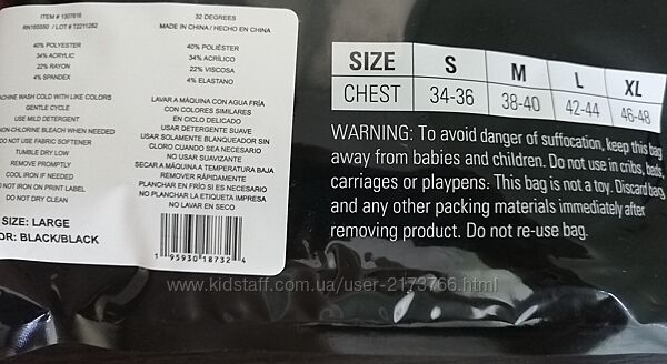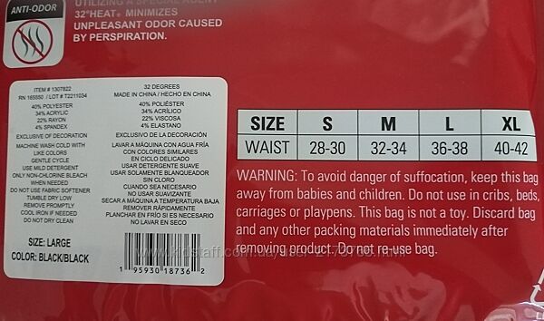Размер L США (на упаковке талия 36-38 inches = 91-96 см, грудь 42-44 inches = 106-112 см).