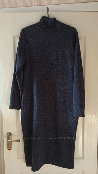 Тепла сукня з подвійної ангори розміру XL. Колір - синій джинс. Чудова якість. Нова, не носилася. Силует прямий. Довжина по спинці 111 см. ПОГ 51 см, ПОС 57 см, довжина рукава 63 см. Повна висота коміру-стійки 12 см. Комір зсередини підбитий сірим трикотажем. Комір за бажання затягується на зав´язки. Є дві врізні кишеньки. Сукня практична, симпатична й зручна. Повернення не передбачене.