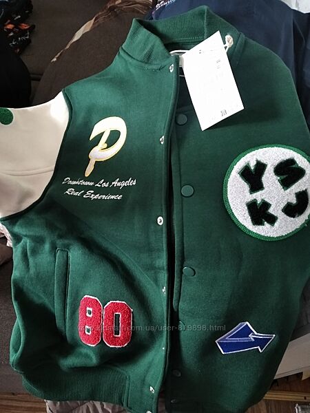 Куртка-бомбер із круглим коміром і довгими рукавами контрастного кольору. Окантовка в рубчик. Застібається на кнопки спереду. Кишені з обшивкою спереду. Нашивки спереду та на рукавах. Тепла м’яка поверхня всередині.Розмір в наявності