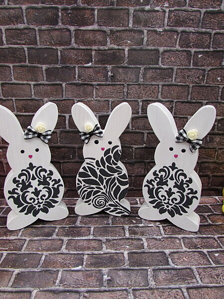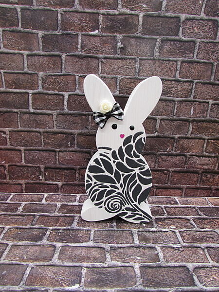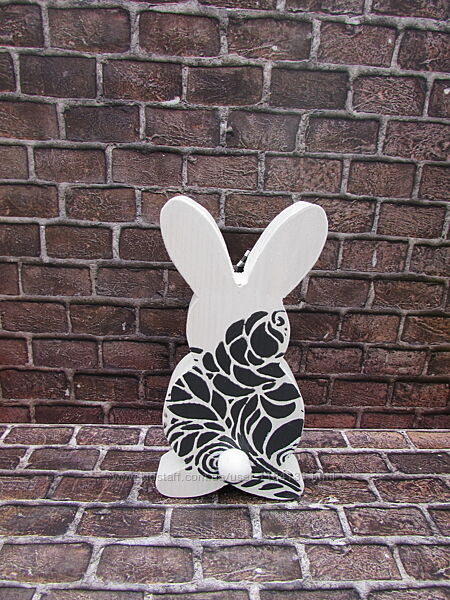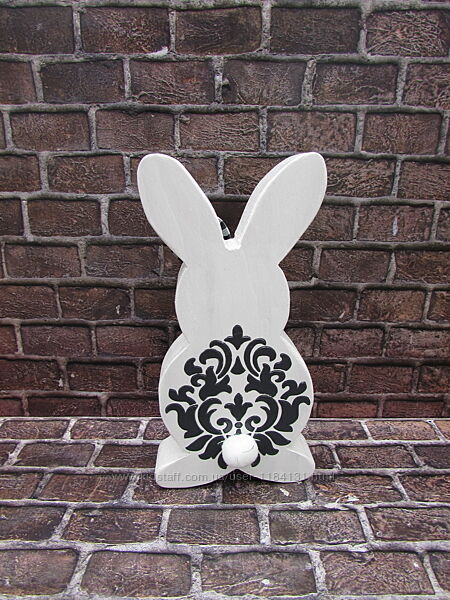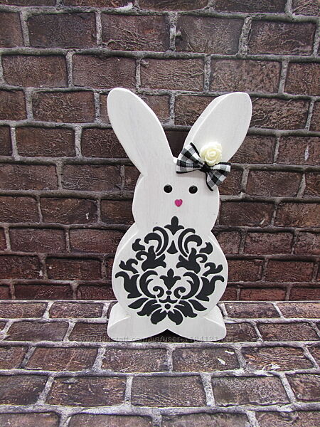 Зайчик з масиву сосни, декорований у техніці трафаретного розпису.Зайчик прикрашений маленьким бантиком та пластиковою трояндочкою.