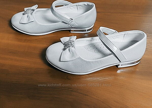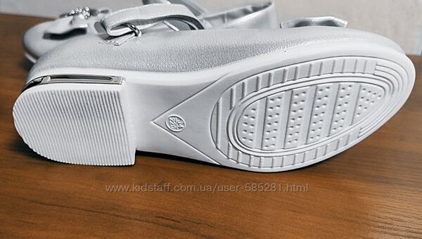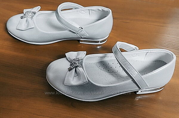 красиві срібні туфельки з елегантним бантиком, він прикрашений стразами, каблук також прикрашений металевою окантовкою, на ніжці фіксується перетинкою на липучці, анатомічна устілка з супінатором та перфорацією - натуральна шкіра, якісне виконання, туфлі виготовлені зі шкірозамінника,