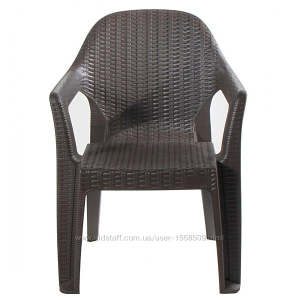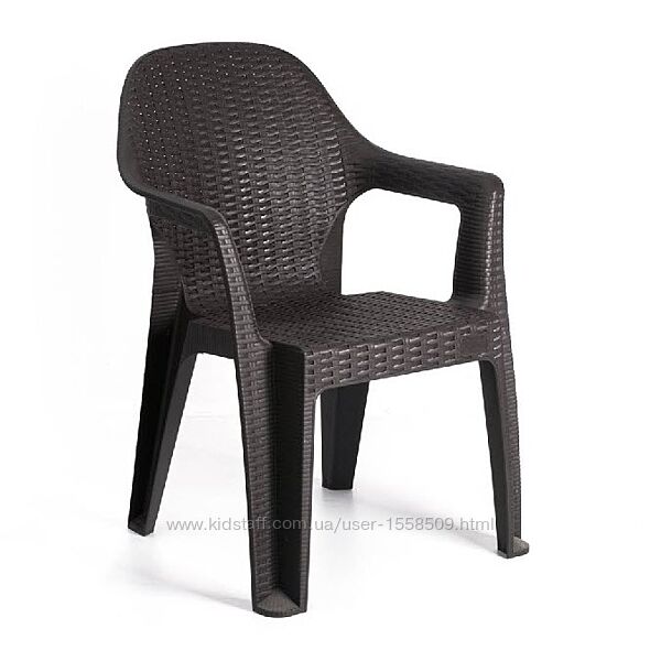 Стілець пластиковий з підлокітниками, матеріал поліпропілен, імітація ротанга, до поліпропілену додано скловолокно, що робить весь стілецьміцнішим, стілець штабельований, ставиться в стопки, ультрафіолетова та
