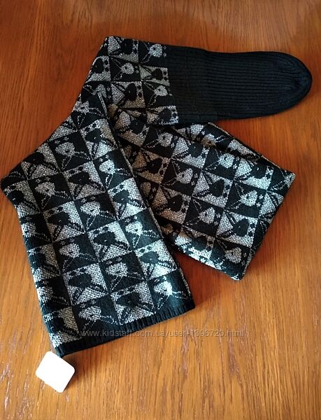 Необычная вешь, шапка вместе с шорфом одним целым. Состав: шерсть75%, 20%нейлон,5%эластан.Ресунок выбит зайчики. Цвет черный,серебренный.Теплая практичная вешь. В живую очень круто смотриться.