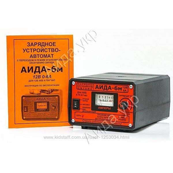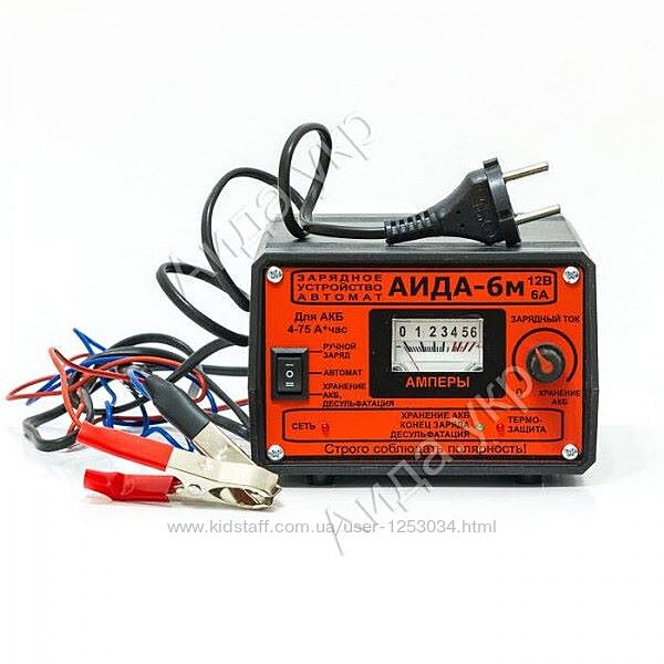 Зарядное устройство АИДА-6м предназначено для зарядки 12В для автомобильных аккумуляторных батарей (АКБ) емкостью от 4 до 75А (с ручной регулировкой ампер-часов) с инструкцией по эксплуатации:* в автоматическом режиме с переходом в режим хранения по окончанию заряда,