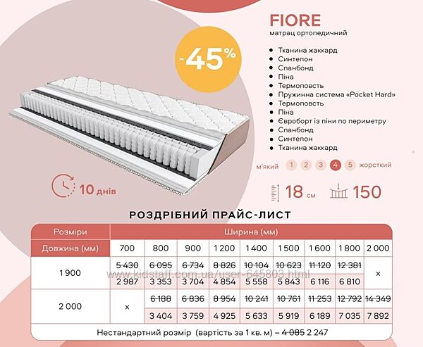 Суперакція -45% на модель матраца Primavera Fiore до 10 вересня!Це доступний за ціною ортопедичний матрац з просунутою пружинною системою «Pocket