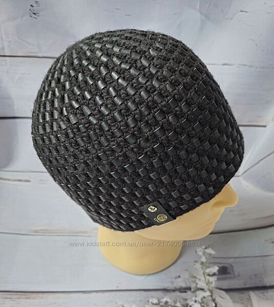 Стильная зимние - осенняя черная шапка Вязаная кожа. Ручная работа