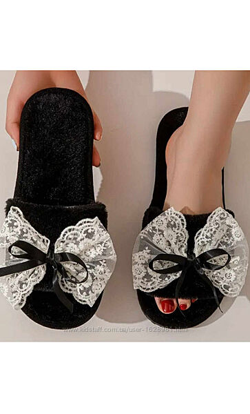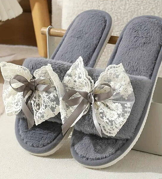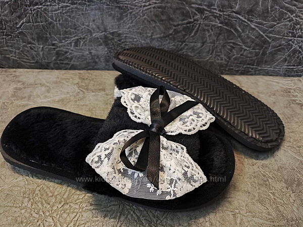 Подробное описание: Пухнасті капці з мереживними бантиками 37 розмір 24 см хутро дом тапочки