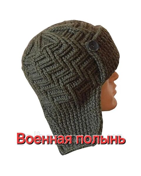 Подробное описание: Зимняя вязаная шапка - ушанка Военная полынь, ручная вязка крючком
