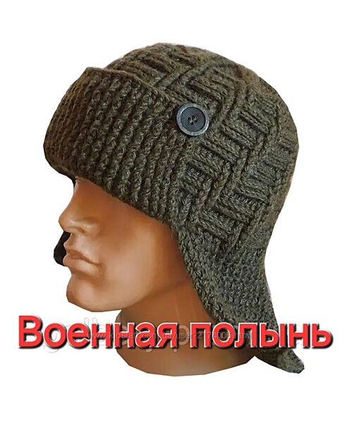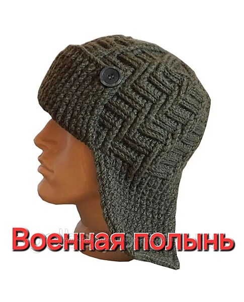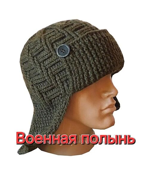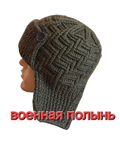 Зимняя вязаная шапка - ушанка Военная полынь, ручная вязка крючком
