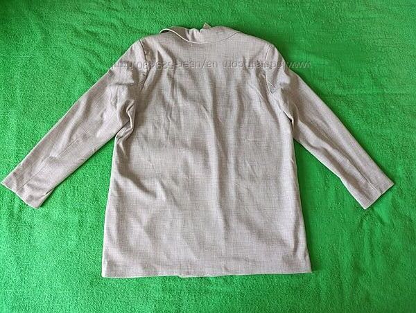 - бежевый удлиненный пиджак Синсей, указан размер ХЛ, внутри полностью на подкладке, без карманов, ткань не плотная, приятная на ощупь, состав: 88% полиэстер, 8% вискоза, 4% эластан