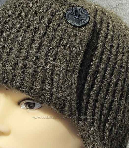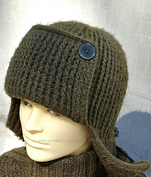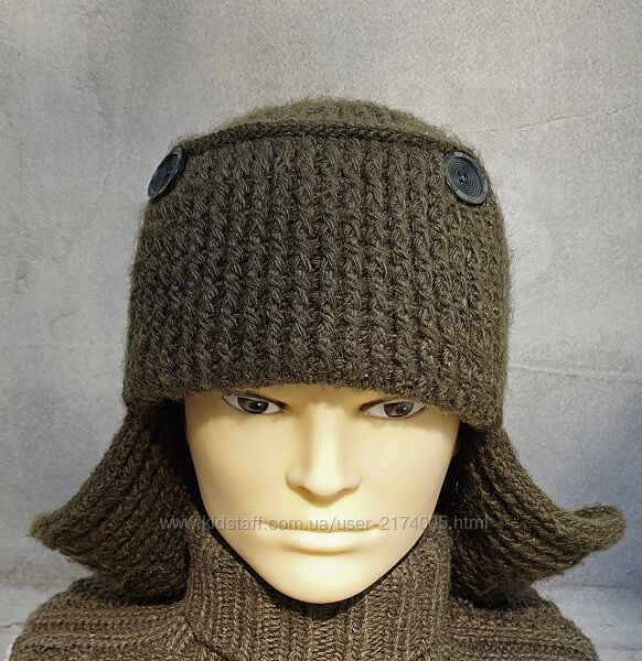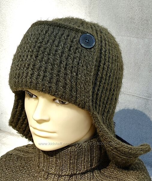 Купить зимнюю вязаную шапку - ушанку "Военная полынь", ручной работыСостав пряжи - 20% меринос, 80% вспученный акрил