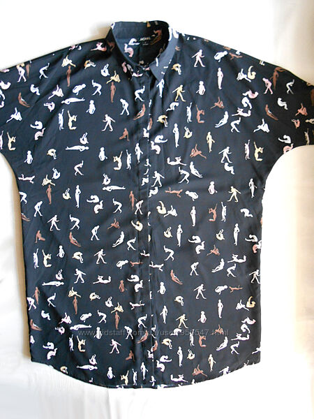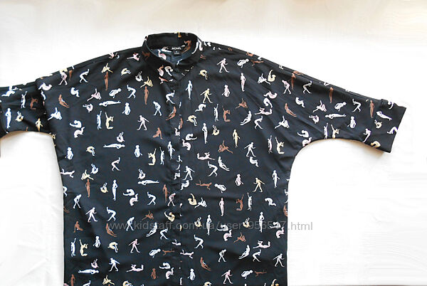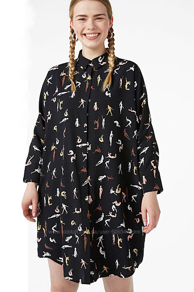 Платье-рубашка свободного кроя с забавным принтом, застежка планка, низ округленный, прорезные карманы сбоку