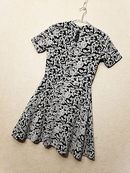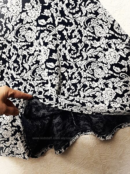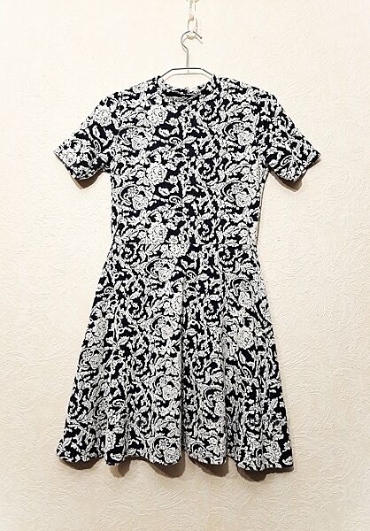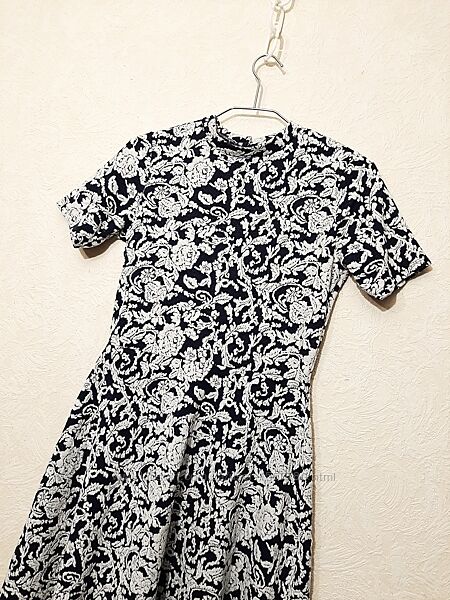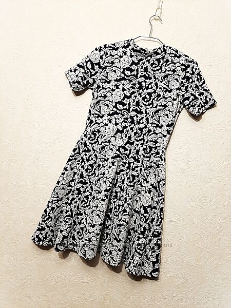 Сукня жіноча трикотажна міні, сорочка-стійка, розширена донизу, чорна, білі квіти, короткі рукави.Бренд Atmosphere. Маркування розміру 36-38, йде на розміри 44-46.