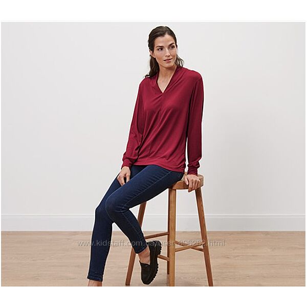 Сорочка з довгим рукавом і V-подібним вирізом, бордо. М´яка текуча віскоза, еластична якість. V-подібний виріз з невеликим коміром-стійкою, кінці рукавів із прикріпленими манжетами та зборками, шов поділу спереду. З еластаном: зберігає форму, ідеальна посадка, високий комфорт при носінні. Перевірено на вміст шкідливих речовин – сторонніми акредитованими інститутами.