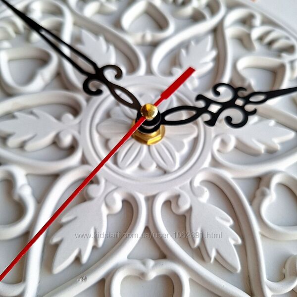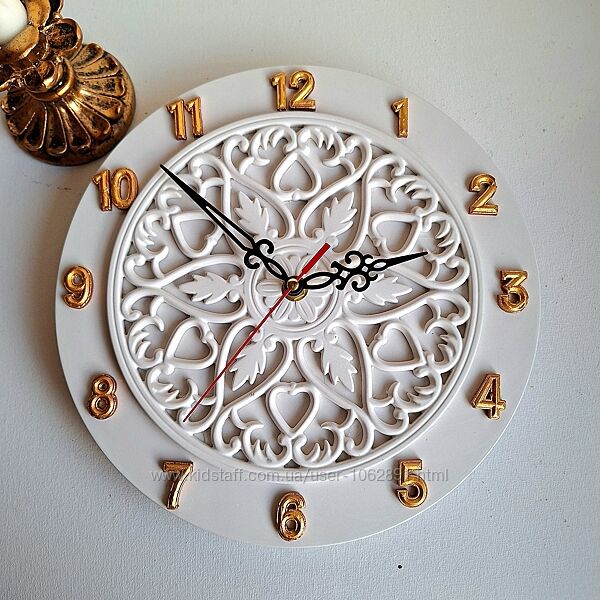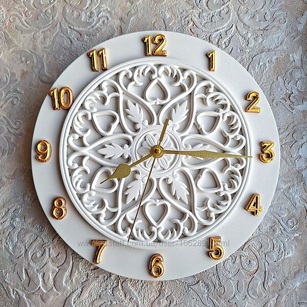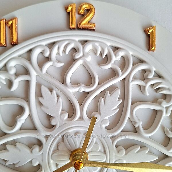 Чудовий розкішний елегантний годинник з рельєфним об´ємним орнаментом додасть затишку вашому дому або стане приємним подарунком близькій людині на будь-яке свято.Цей вишуканий стильний годинник повністю ручної роботи, в білому кольорі з золотими об’ємними цифрами.