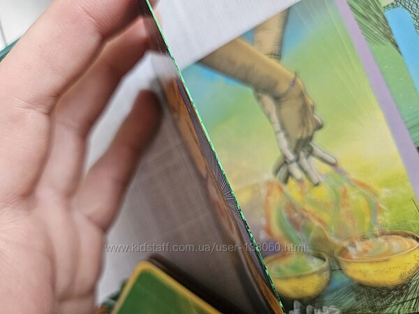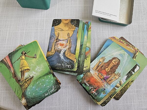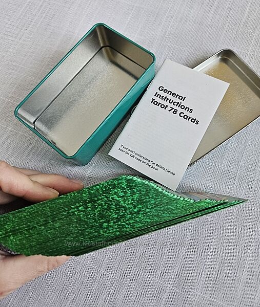 Оновлена версія карт Таро Світлого провидця з зеленим голографічним зрізом в металевій коробці. Абсолютно нові, не використовувались за призначенням. Дуже красиві зображення і цупкі на дотик.
