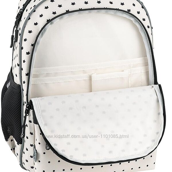Запатентована анатомічна спинка Ergo Kids з м´якими подушечками з дихаючої сіточки. Широкі та зручні S-подібні лямки, ергономічна ущільнена ручка, ручка-петля – дбають про комфорт дитини. Нагрудний ремінь фіксує рюкзак у зручному положенні та допомагає рівномірно розподілити навантаження. У рюкзаку 2 місткі відділення для зошитів, підручників, канцелярії. Внутрішні роздільники та фіксуюча резинка допомагають акуратно складати речі. Органайзер у другому відділенні. Об´ємна фронтальна кишеня.2 бічні кишені на резинці для пляшечки з водою або термоса. Декор: аплікація із плюшу, гумова підвіска у формі серденька.