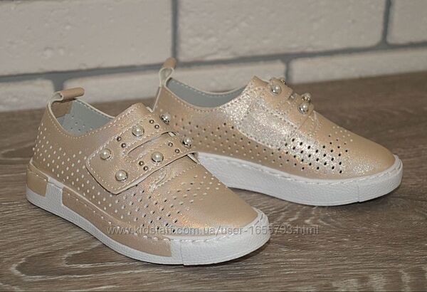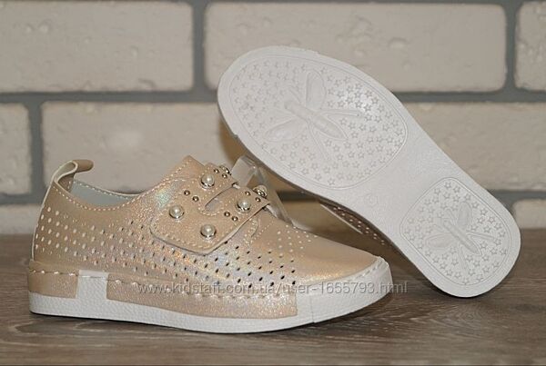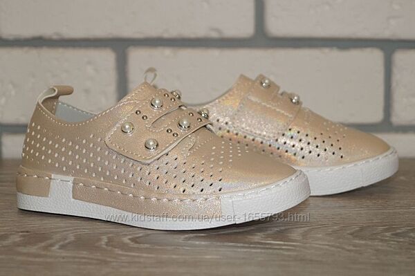 Брендова модель золотистих сліпонів для дівчинки. Мають якісне пошиття, зручну колодку та неймовірно стильний вигляд, який допоможе створити багато образів у стилі casual.Пошиті із штучної шкіри високої якості. Всередині підкладка з екошкіри. Устілка шкіряна із супінатором. Жорсткий задник добре тримає форму. Кросівки легко взуються і фіксуються на ніжці за допомогою широкого ремінця з липучкою. Сліпони мають наскрізну перфорацію, завдяки чому мають підвищену циркуляцію повітря, що запобігає запотіванню ніжок. Підошва максимально легка і гнучка, прошита по канту.